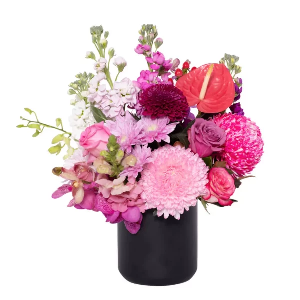 A rich and fabulous array of beautiful pinks, mauves and burgundy graduating creating a raspberry rainbow of rich colours. Ceramic pot is 12cm and flowers are arranged to fit into the pot.